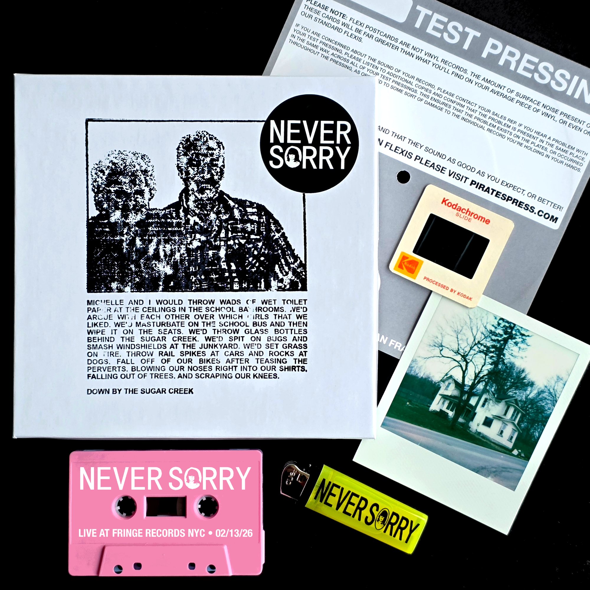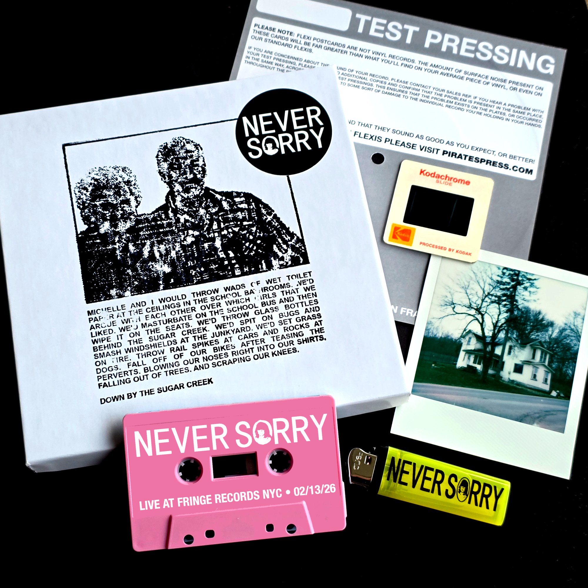 ** exclusive-to-keepsake box PINK variant of NEVER SORRY 'Live At Fringe Records NYC 02/13/26' cassette that includes an exclusive-to-keepsake box bonus live recording from Cincinnati, Ohio on the B-SIDE.